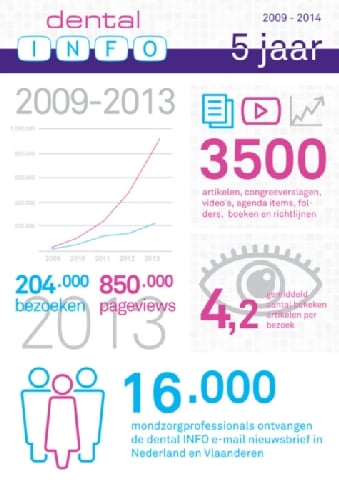 In maart 2009 ging dental INFO online en verstuurden wij de eerste e-mailnieuwsbrief. 5 jaar geleden alweer. Vanuit het niets heeft dental INFO zich ontwikkeld tot een belangrijke nieuws- en kennisportal voor de mondzorg in Nederland en Vlaanderen. Ruim 16.000 mondzorgprofessionals en – praktijken ontvangen de dental INFO e-mailnieuwsbrief en maandelijks worden ruim 100.000 pagina’s op dentalinfo.nl bekeken. Een resultaat waar wij erg trots op zijn en waarvoor we onze trouwe dental INFO lezers hartelijk bedanken!