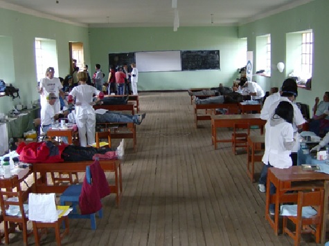 We werden naar een klas geleid, dat zou gaan dienen als onze kliniek in de komende week. Er stonden schooltafeltjes en kinderstoeltjes op een stoffige houten vloer. De ramen waren hier en daar kapot, er was verlichting en één stopcontact. Zoals elk jaar begonnen we met het overleg over hoe we de ruimte het best konden gaan indelen. Onze ervaring hielp ons, zodat we snel over konden gaan met het inrichten van onze werkruimte. We hadden twee grote kisten en wat koffers waar we al ons instrumentarium in bewaarden. Enkele tafels werden aaneengesloten en met groene lakens bedekt. Daar werden de instrumenten opgelegd, alles afkomstig van DHIN.