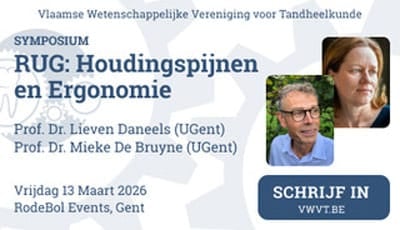 Musculoskeletale klachten komen veel voor. Bij tandartsen vooral nek- en rugklachten, en pols- en elleboogklachten bij mondhygiënisten. Ook bij studenten THK zien we reeds de klachten toenemen. In dit symposium bespreken we de prevalentie en ergonomie.