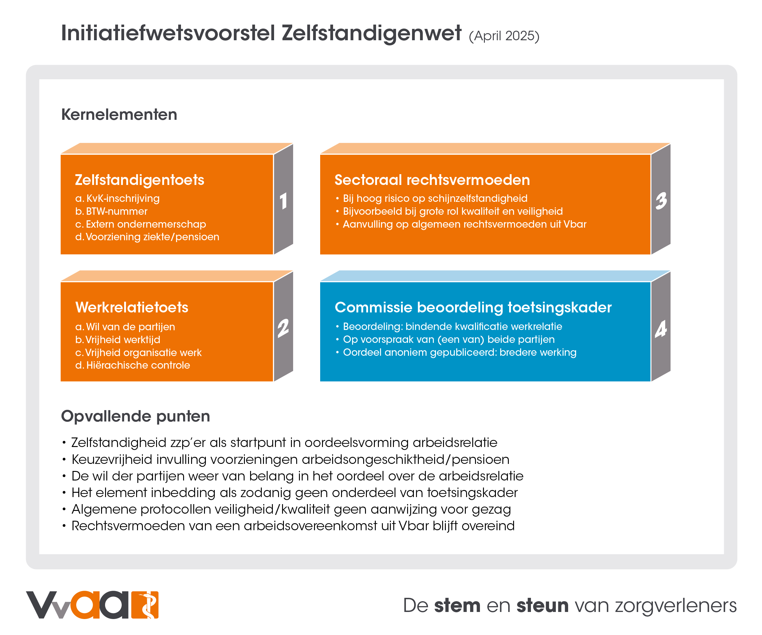 Dit voorjaar verscheen vanuit de VVD-fractie in de Tweede Kamer met de ‘Zelfstandigenwet’ zelfs een alternatief zzp-wetsvoorstel. Mede-initiatiefnemers D66 en CDA wonnen fors terrein in de Tweede Kamer. Anders dan bij de Vbar begint dit voorstel met een ‘Zelfstandigentoets’, dit levert maatschappelijke sympathie op. Het is echter nog een eerste concept, met veel haken en ogen vanuit uitvoerings- en juridisch-technisch perspectief.