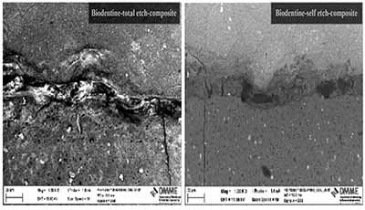 SEM-afbeeldingen van het dentine voor en na het aanbrengen van VOCO Profluoride Varnish + BioMin linksboven: niet-behandeld dentine rechtsboven: aanbrengen van VOCO Profluoride Varnish + BioMin onder: dentine na aanbrengen van VOCO Profluoride Varnish + BioMin