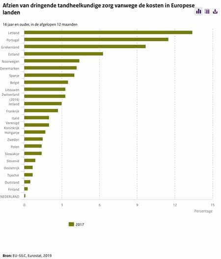 Bovendien laat Nederland hierin een bijzonder laag cijfer zien in vergelijking met andere Europese landen. Uit onderstaande grafiek blijkt dat in Nederland het laagste percentage van de bevolking afziet van dringende tandheelkundige zorg vanwege de kosten. In Letland en Portugal mijdt zelfs meer dan 10 procent van de bevolking de tandarts om deze reden.