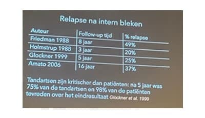 Relapse na intern bleken komt vaak voor en kan variëren van 25% tot 50%. Het is belangrijk om patiënten goed te informeren over de mogelijkheid van relapse, zodat zij zich bewust zijn van dit risico. Over het algemeen zijn tandartsen vaak kritischer over de resultaten dan de patiënten zelf.
