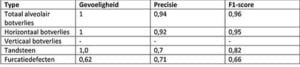 De resultaten voor gevoeligheid, precisie en F1-score waren wisselend voor de verschillende types beoordeelde onderdelen. Zo werd totaal alveolair botverlies zeer goed gedetecteerd, terwijl de kunstmatige intelligentie verticaal botverlies niet kon identificeren. De exacte waardes zijn weergegeven in de tabel.