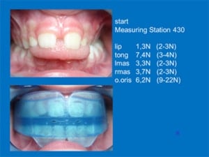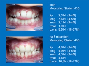 Foto’s na 3 jaar: resultaat met metingen waaruit blijkt dat de tongdruk minder is geworden. De metingen tonen aan dat de orofaciale spieren meer in balans komen.