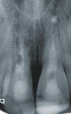 - Niet afgevormd: Het klinisch en radiografisch monitoren van element is nu belangrijk. Bij een niet afgevormde wortel is er namelijk kans op revascularisatie. Indien er toch sprake is van necrose, moet er een endodontische behandeling worden uitgevoerd. Bij een open apex kan het handig zijn om ook een apexresectie uit te voeren.