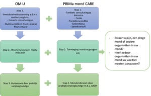 Babette Everaars, onderzoeker aan de Hogeschool Utrecht, ACTA en het Julius Centrum (UMCU), promoveert momenteel op dit onderwerp met het project ‘PRIMa mond CARE’. Bij dit project worden mondgezondheidgegevens toegevoegd aan het OM U programma, een interventie waar kwetsbare ouderen proactief worden opgespoord en zorg op maat ontvangen. Bij het PRIMa mond CARE project, wordt onderzocht of de voorspelling van kwetsbaarheid van ouderen nauwkeuriger wordt door de toegevoegde mondgezondheidgegevens. Het onderzoek vindt plaats in Gezondheidscentrum Maarn-Maarsbergen.